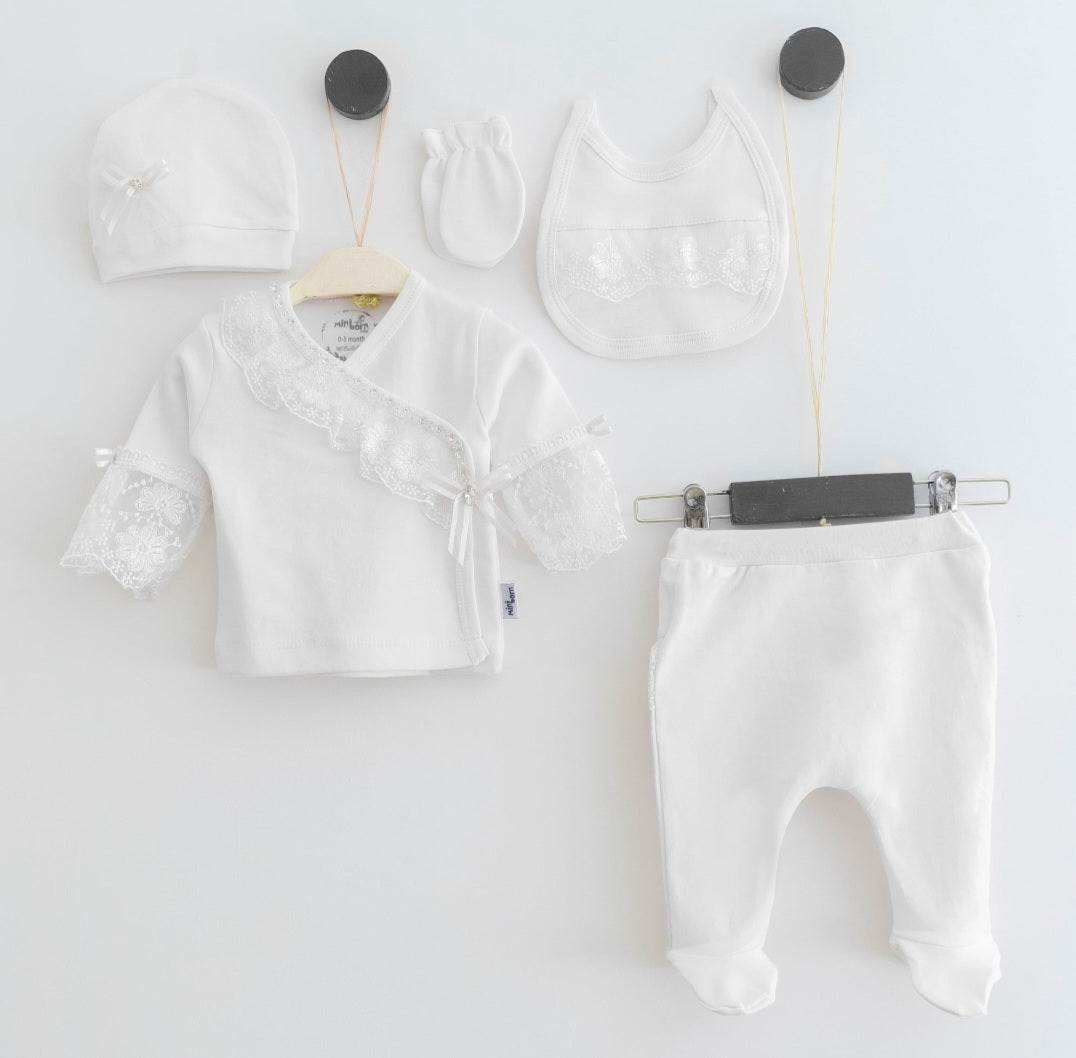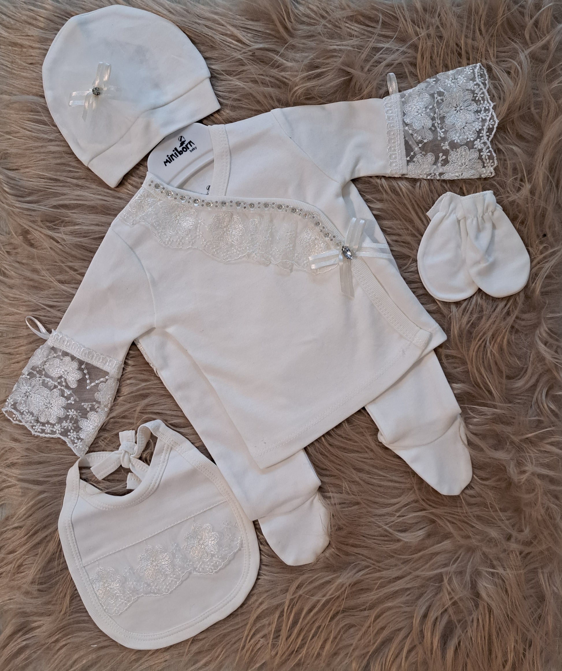 Lace and Pearl Stone set of 5 includes a hat with bow detailing, matching top and trousers with lace and diamontes, lace bib and soft mittens. A beautiful set for Christmas and special occasions x